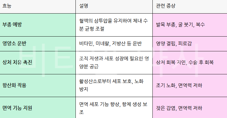 알부민은 간에서 생성성되어 혈액 속에 존재하는 단백질로, 그 주된 기능은 혈관 내 수분 유지 즉, 삼투압을 유지하는 것입니다. 삼투압은 세포와 혈관 사이에서 수분이 어떻게 이동하는지를 결정하는 중요한 요소인데, 알부민이 부족할 경우 체액이 혈관 밖으로 빠져나가 부종이 발생할 수 있습니다. 또한 알부민은 다양한 물질과 결합해 운반하는 작용을 합니다. 예를 들어 지방산, 약물, 호르몬 등이 알부민에 결합하여 혈액을 통해 안정적으로 이동합니다. 이런 운반 기능은 체내에서 중요한 대사 균형을 유지하는 핵심적인 기전입니다. 또한 추가적으로 항산화 효과와 면역조절 효과 등이 있습니다.